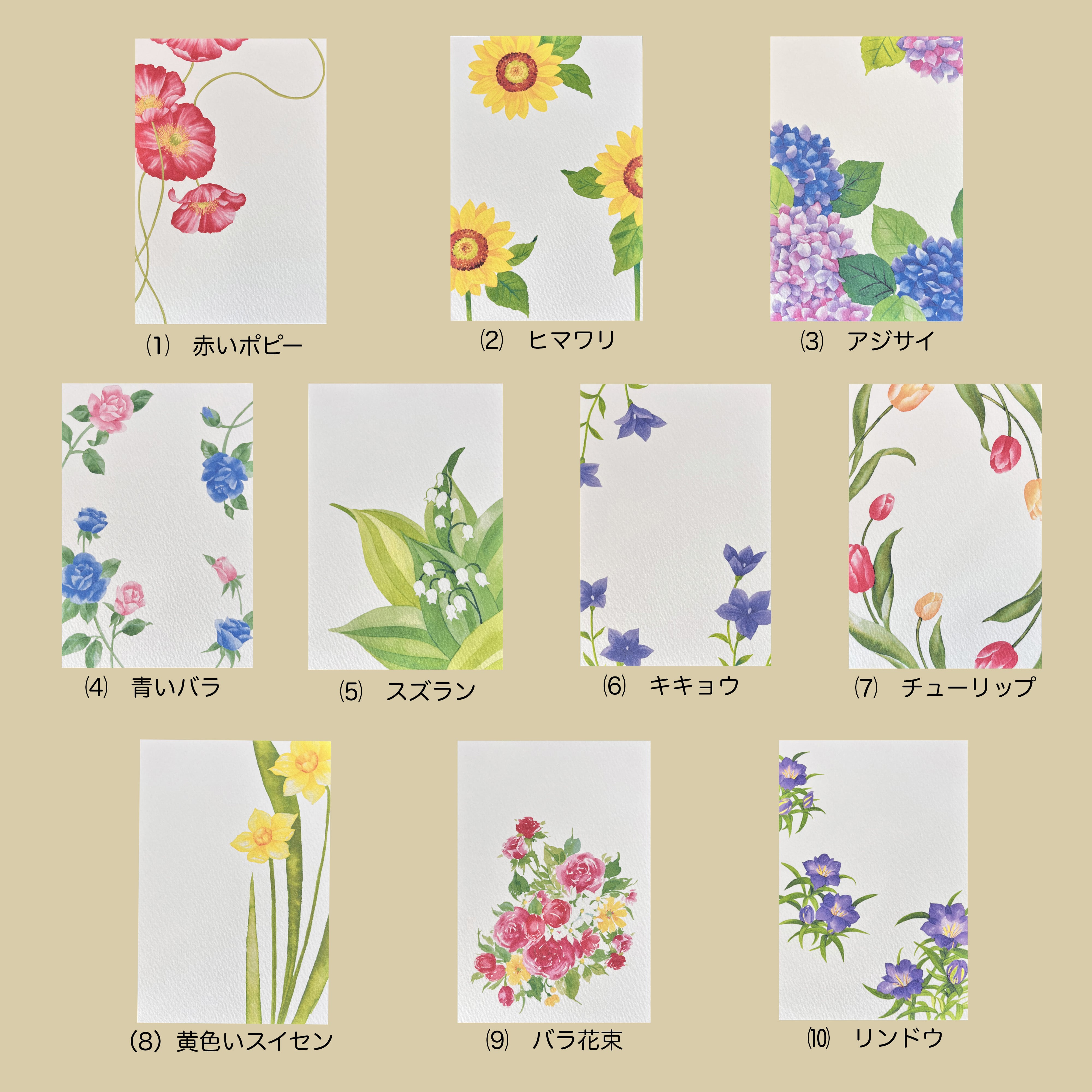 水彩で描いた季節の花のポストカードの「3枚セット」です