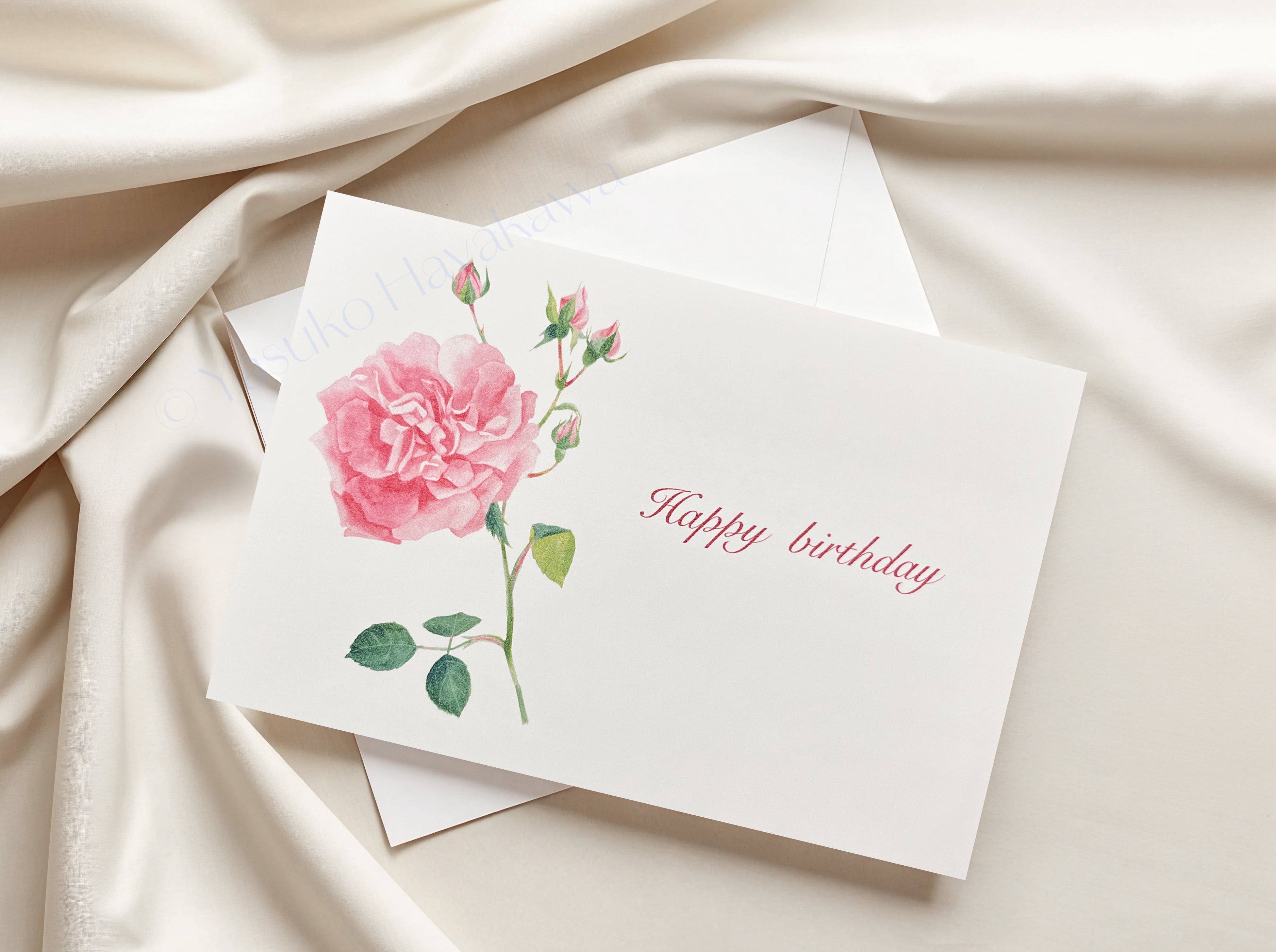 水彩で描いたピンク色のバラ花のバースデーカードの「3枚セット」です