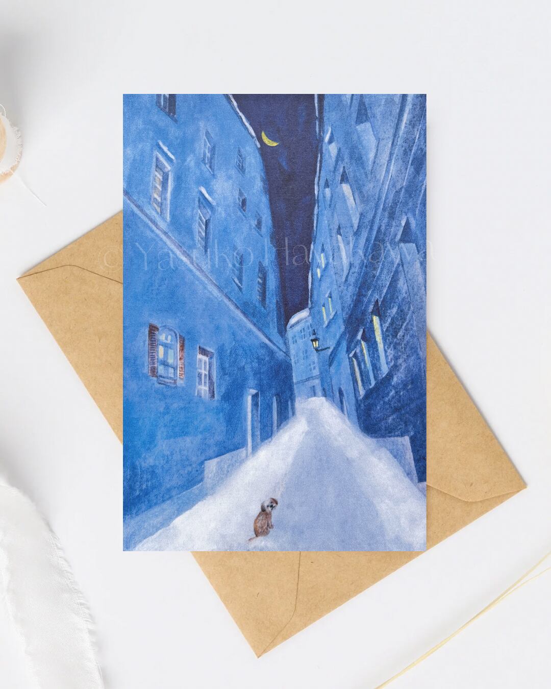 水彩で描いた、三日月の夜の町と子犬のイラストレーションのポストカード