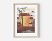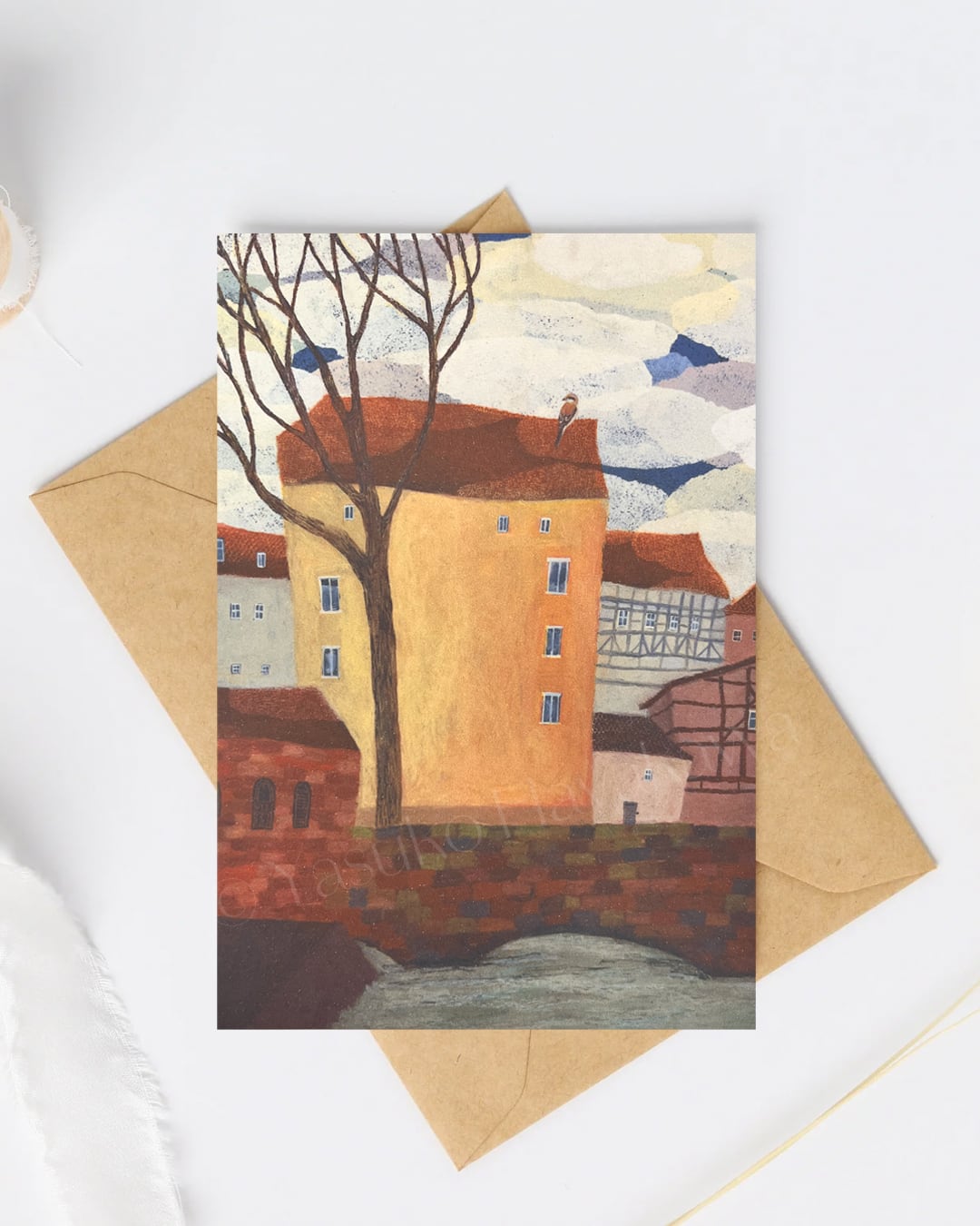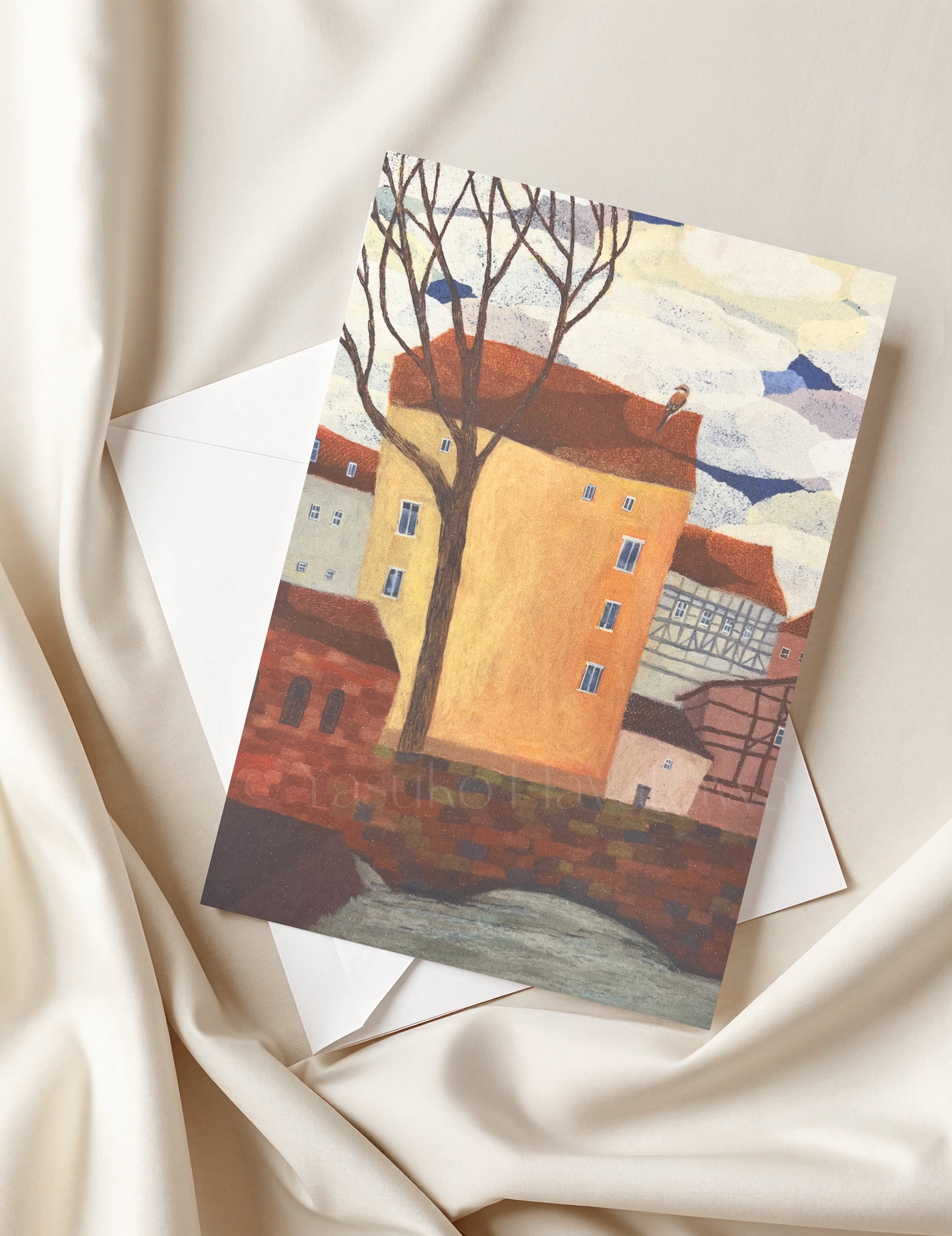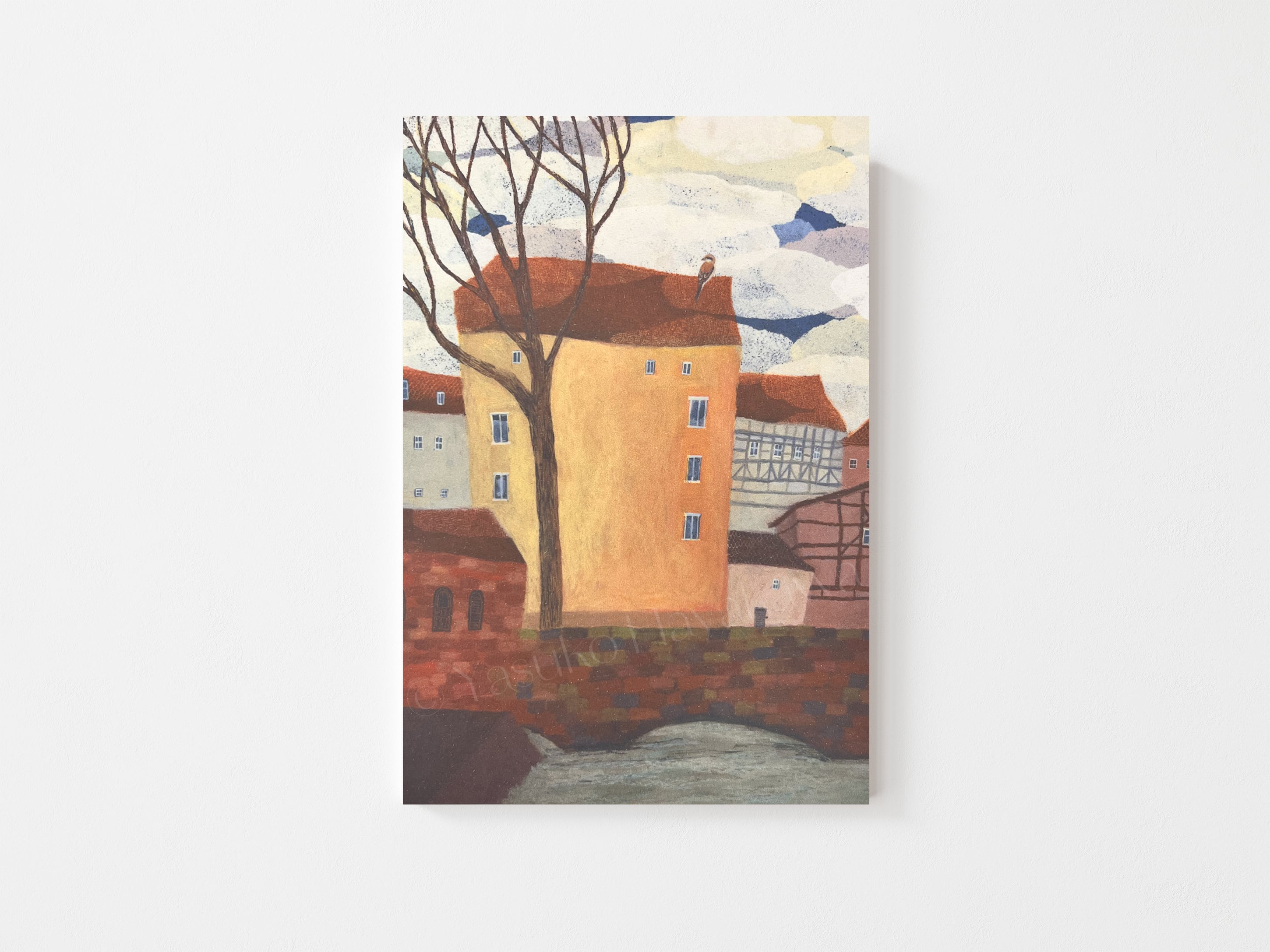 オイルパステルで描いた、赤い屋根と小鳥と雲のイラストレーションの
