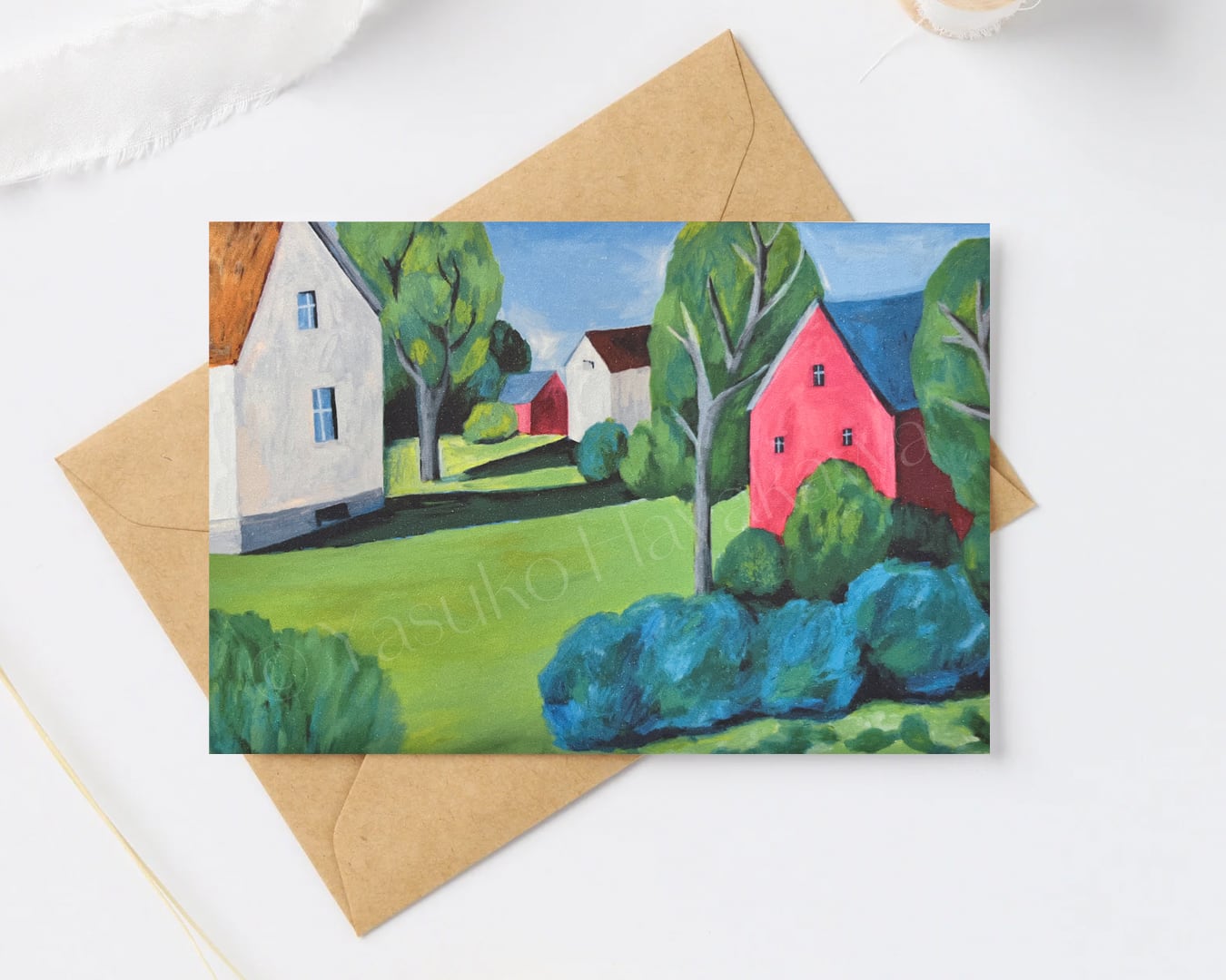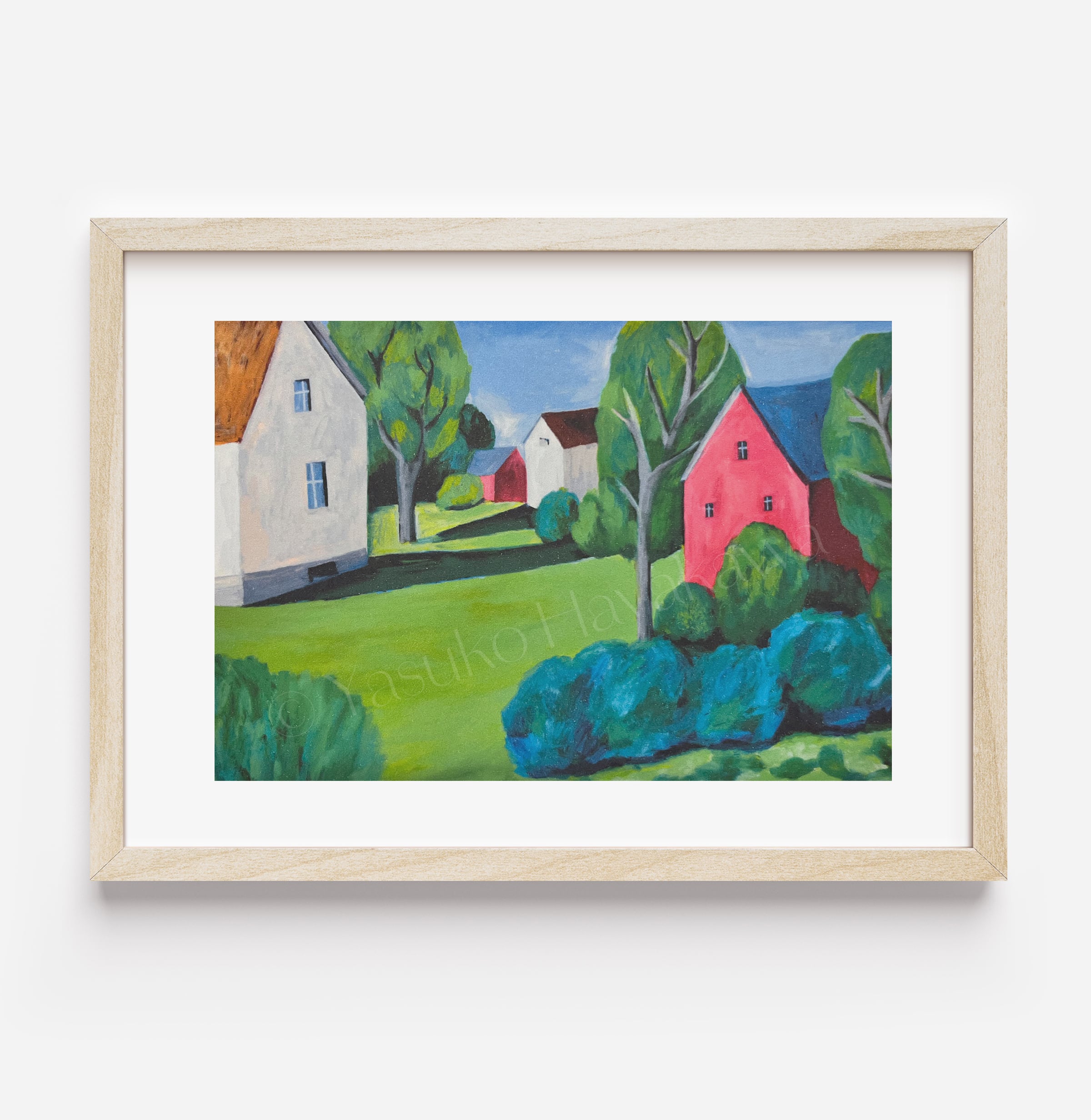 オイルパステルで描いた、北欧の赤い家の風景イラストレーションの