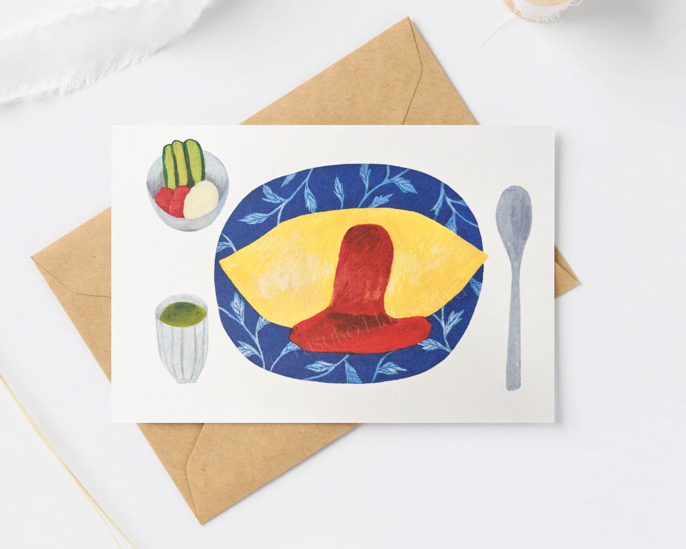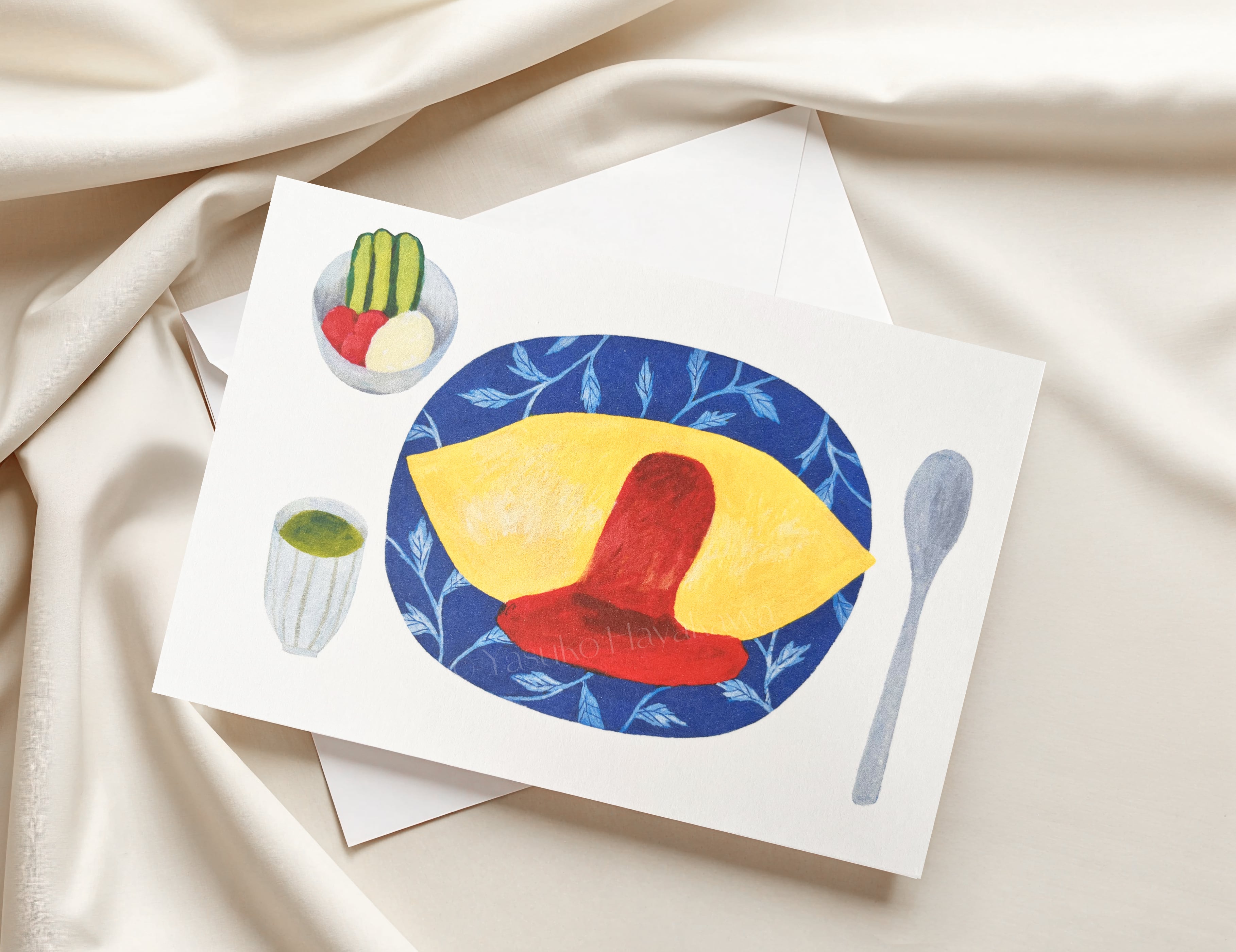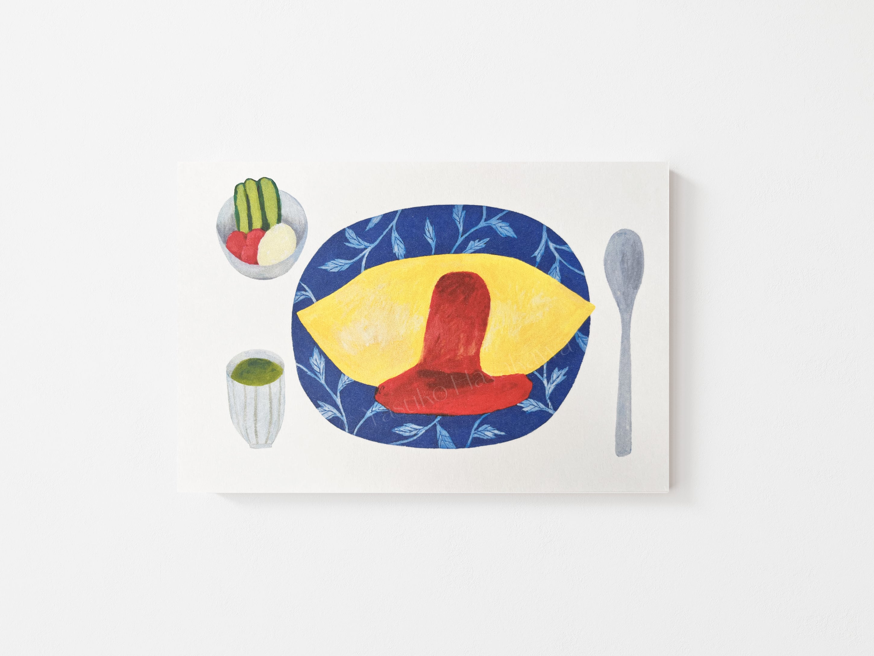 オイルパステルで描いた、オムライスとサラダのイラストレーションの