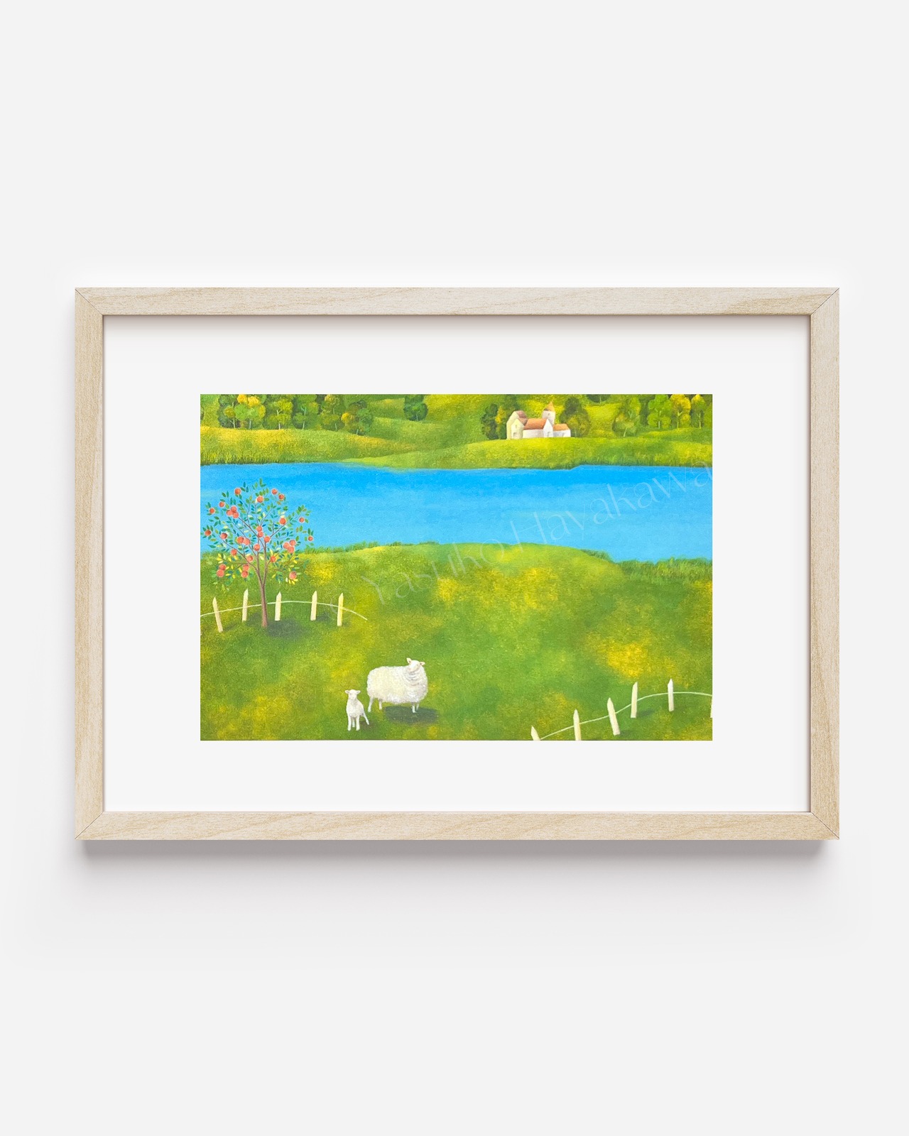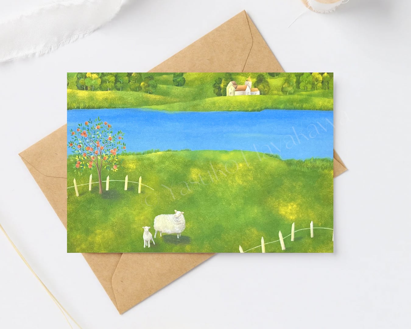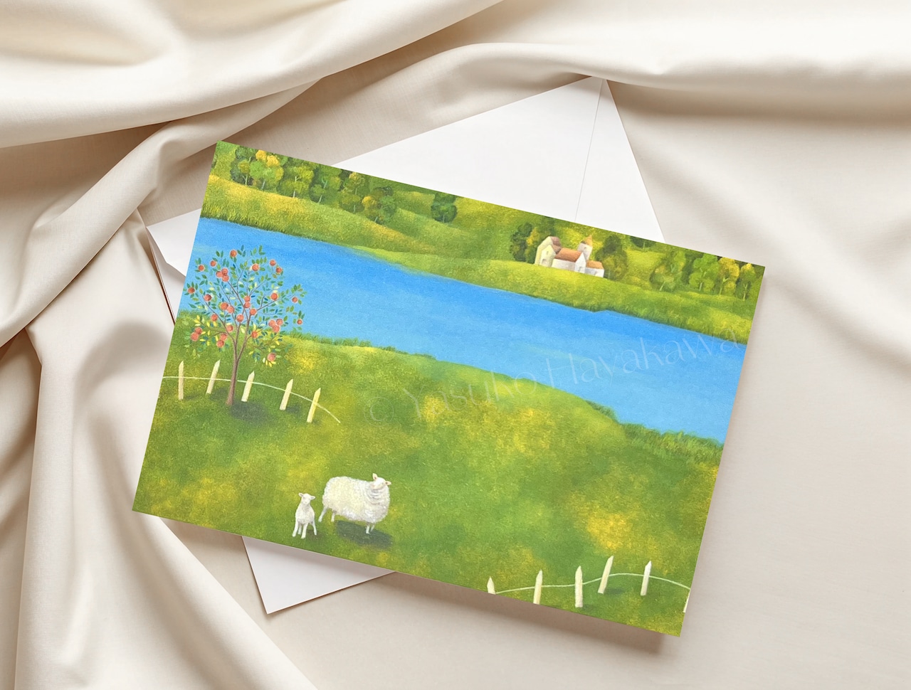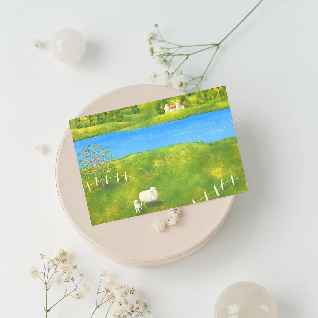 湖のそばの草原で遊ぶ、ひつじの親子の風景をスポンジタッチで描いた水彩画の