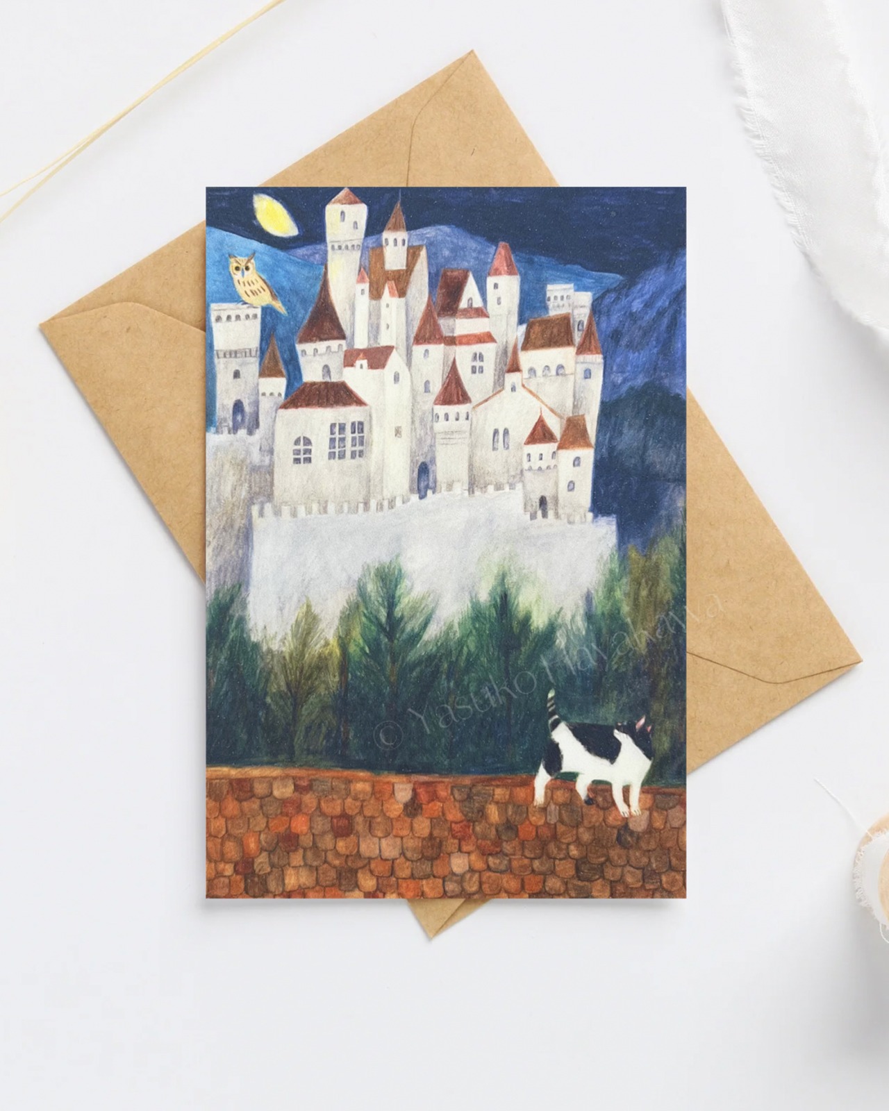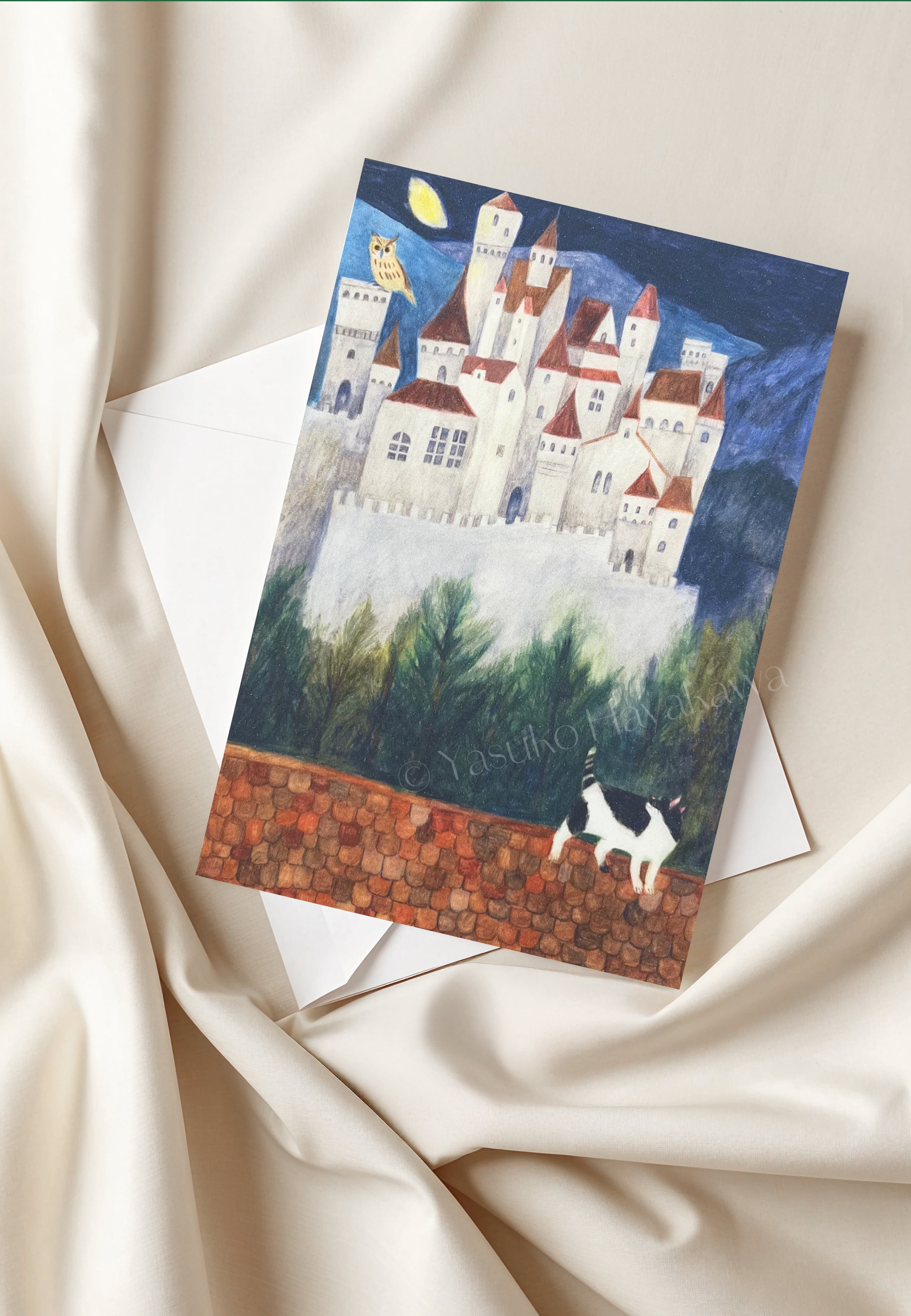 水彩色鉛筆で描いた、猫とお城とフクロウのイラストレーションのポストカード「3枚セット」です