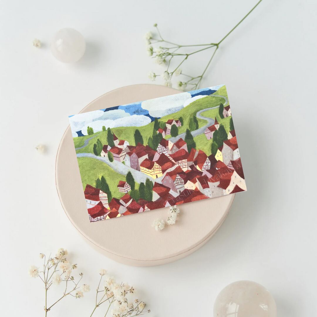 赤い屋根の木組みの家が立ち並ぶ、ヨーロッパの風景をオイルパステルで描きました