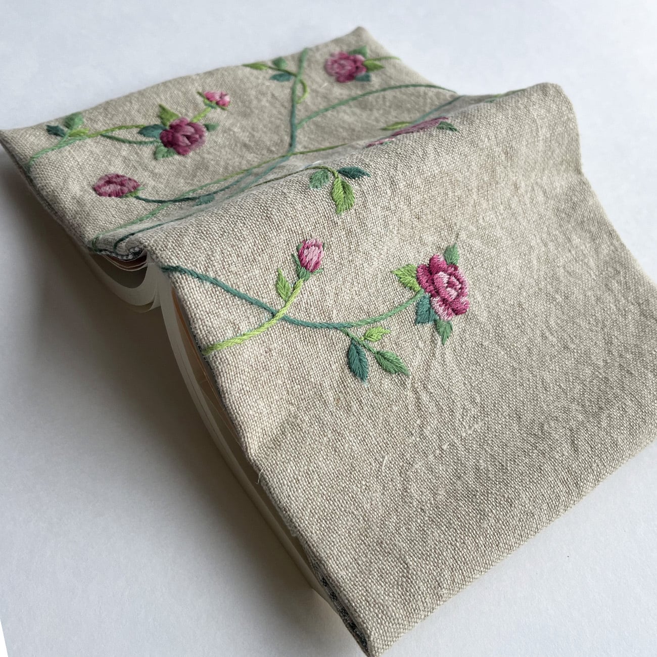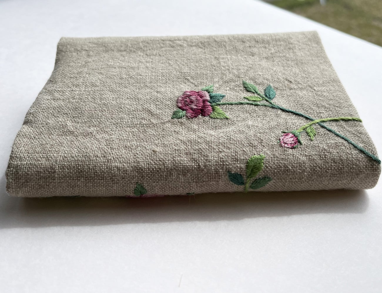 濃いピンクのつるバラの刺繍をした文庫本カバーです。