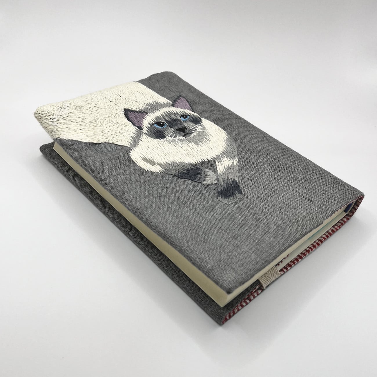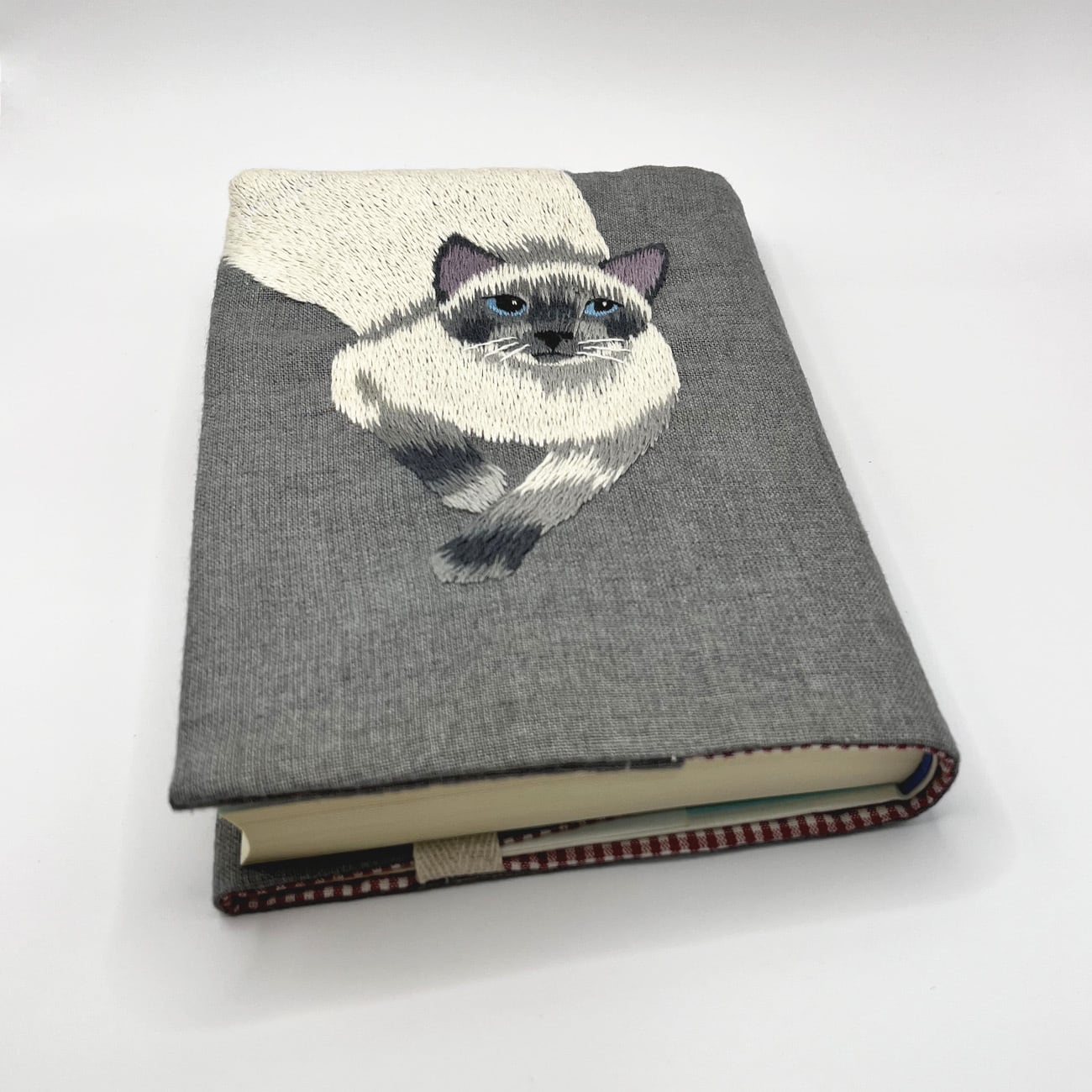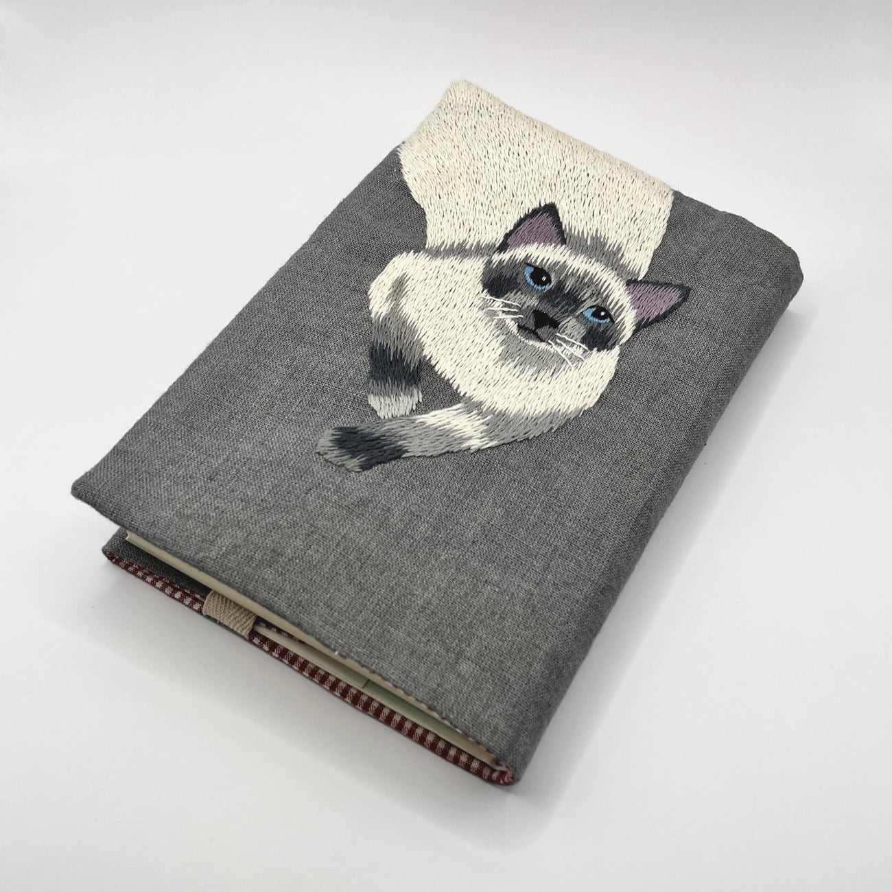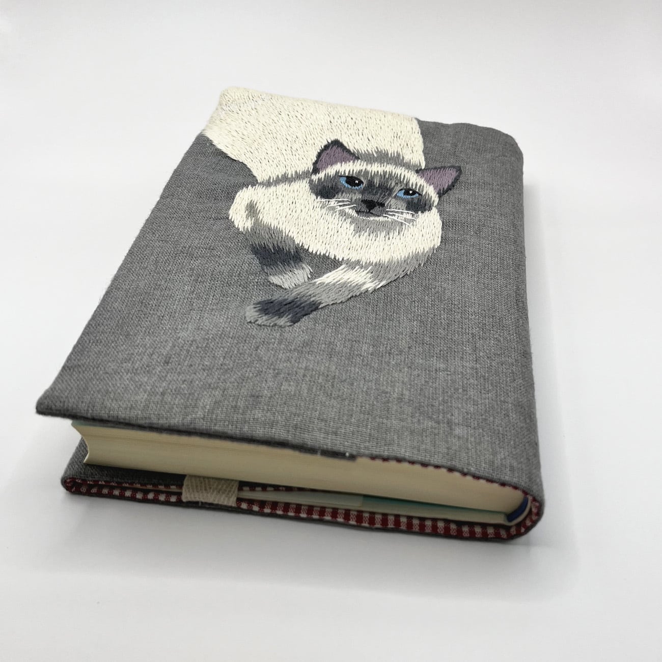 シャム猫の刺繍をした単行本サイズのブックカバーです。