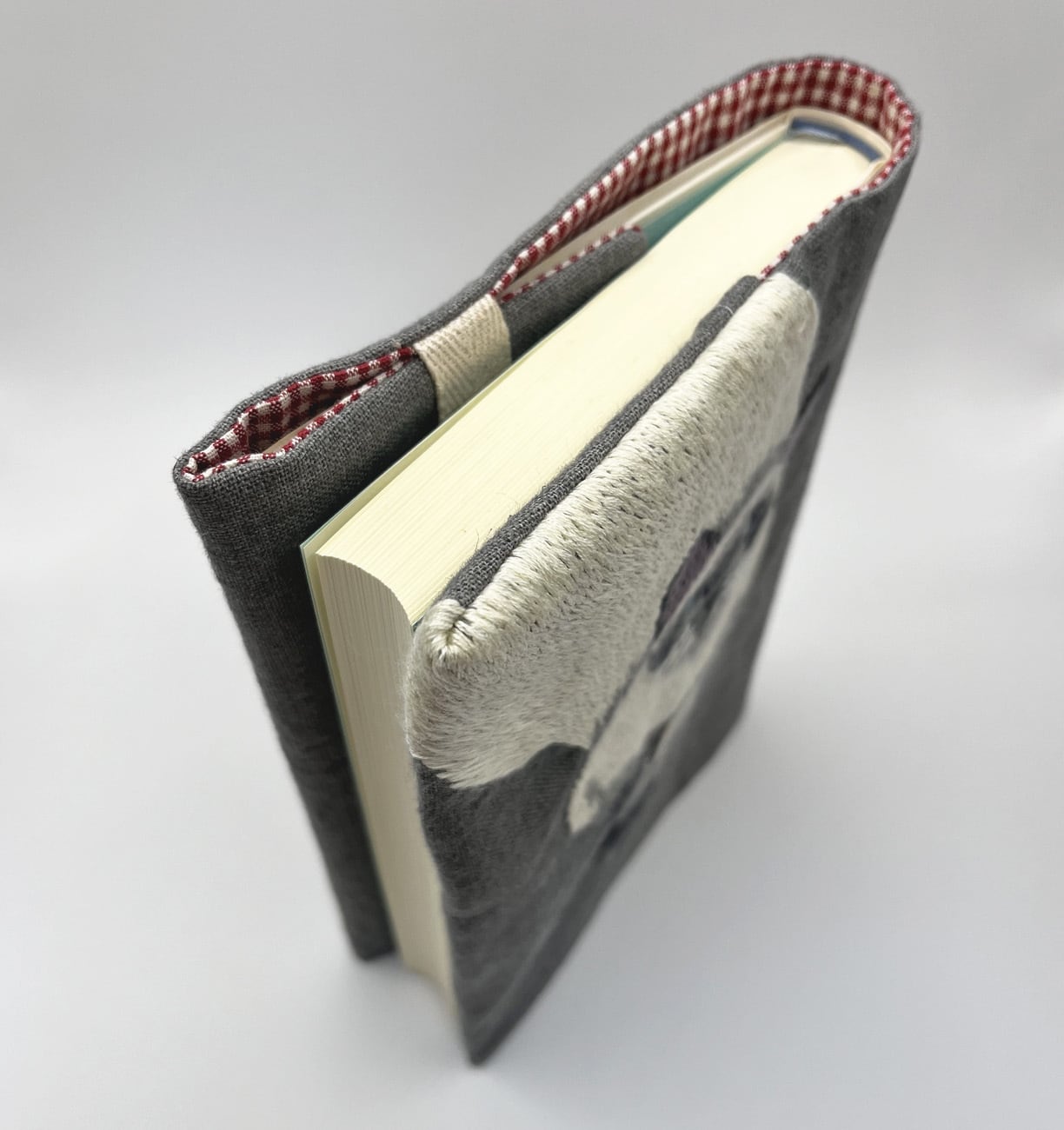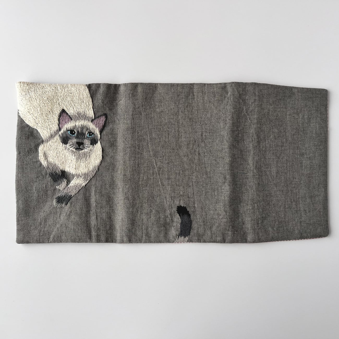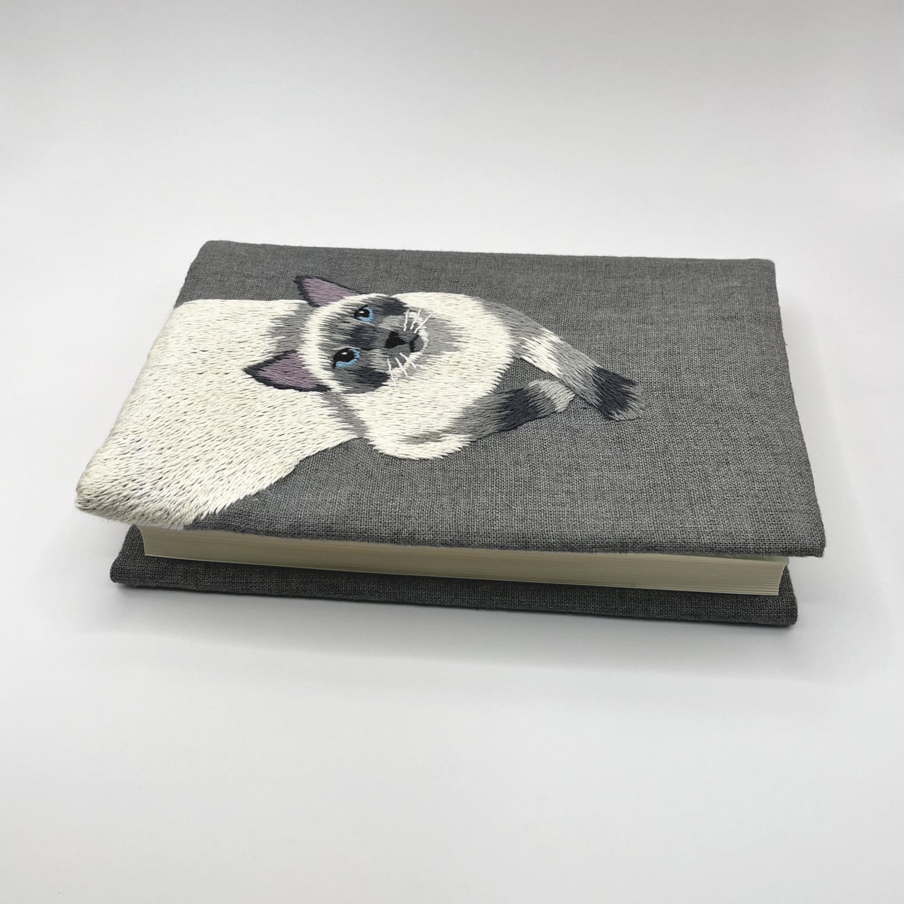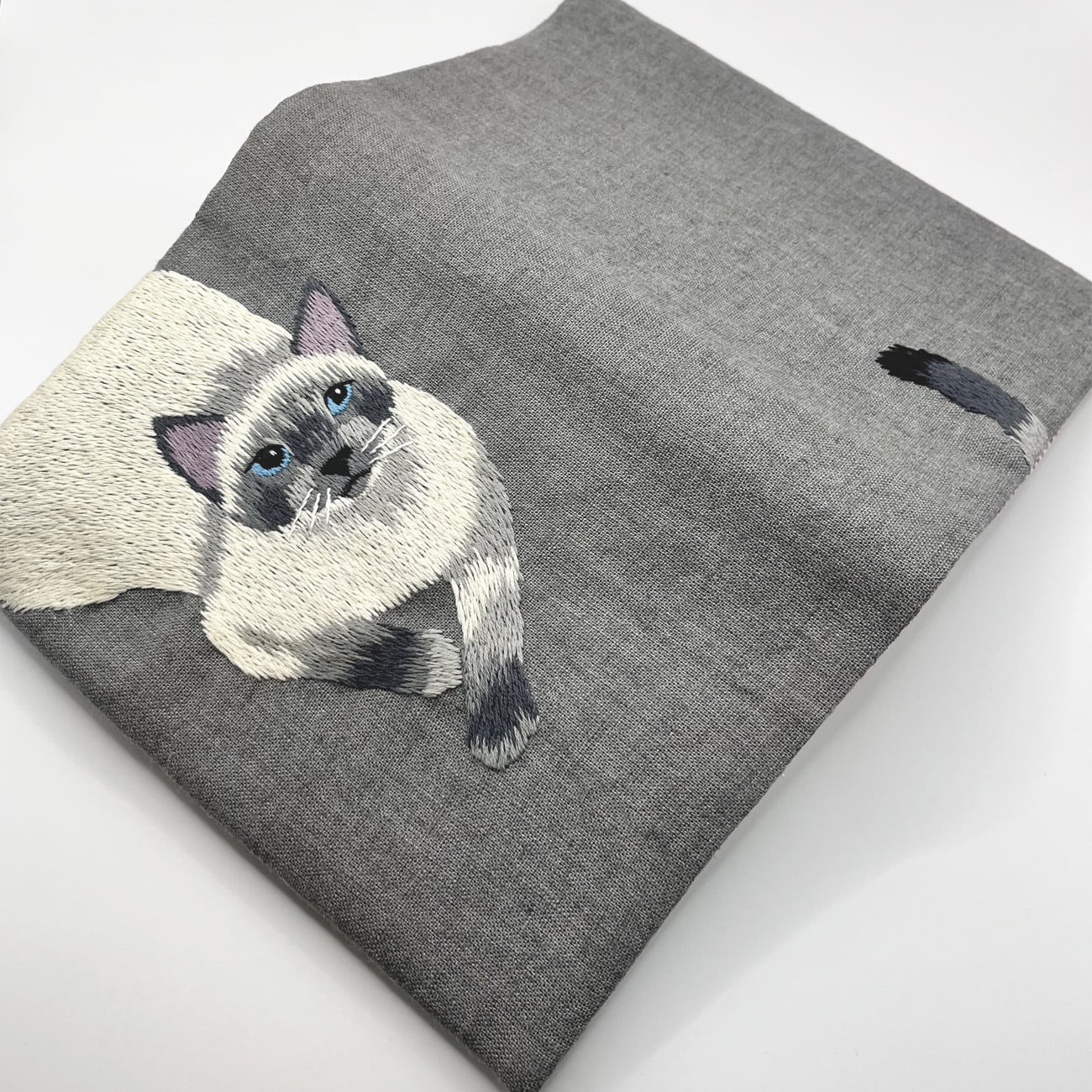 シャム猫の刺繍をした単行本サイズのブックカバーです。