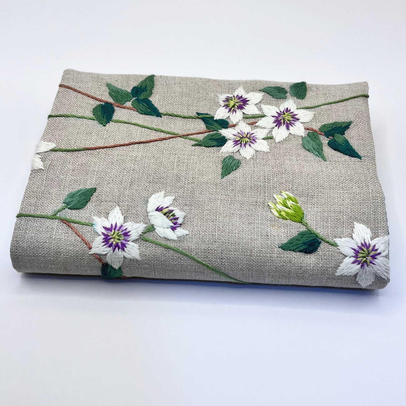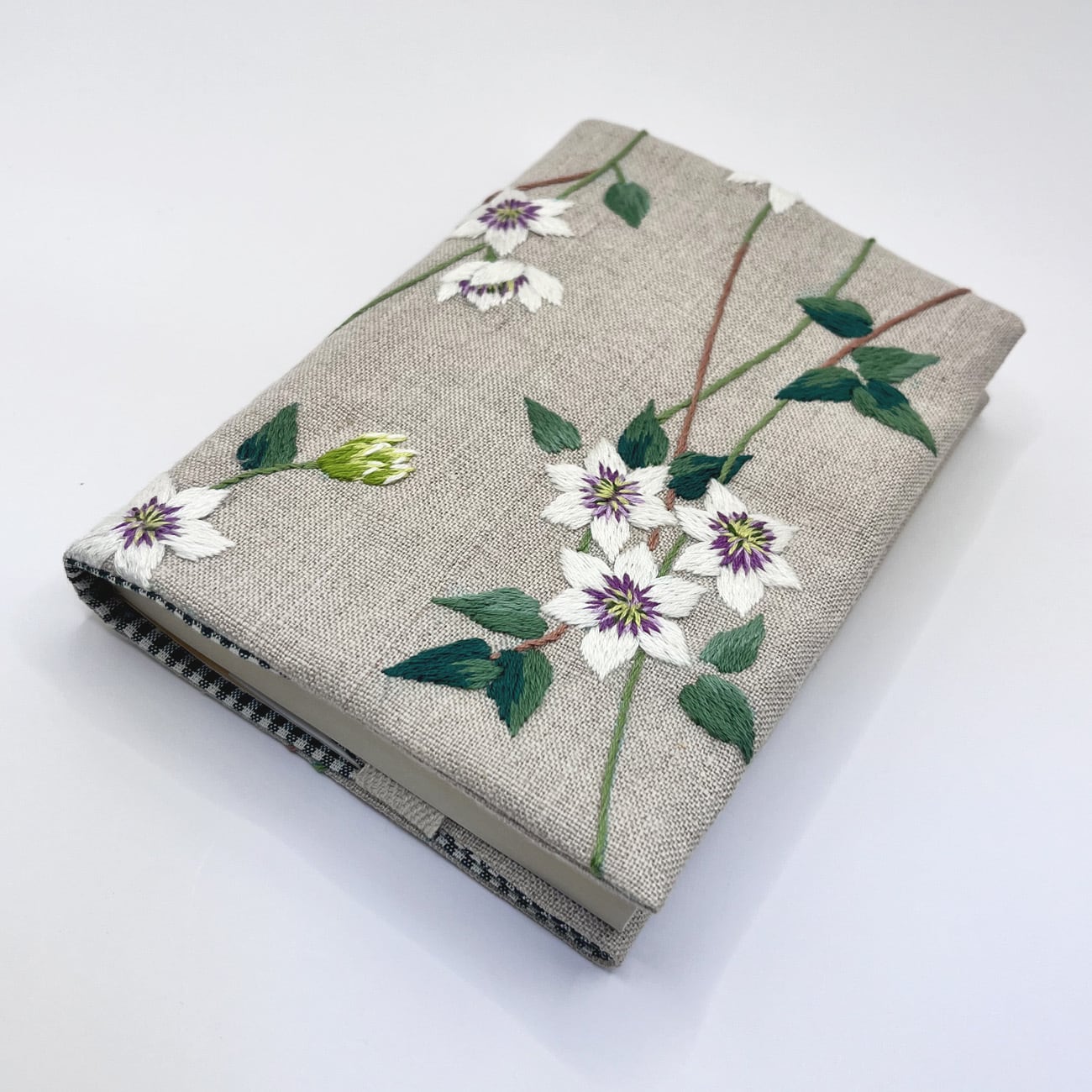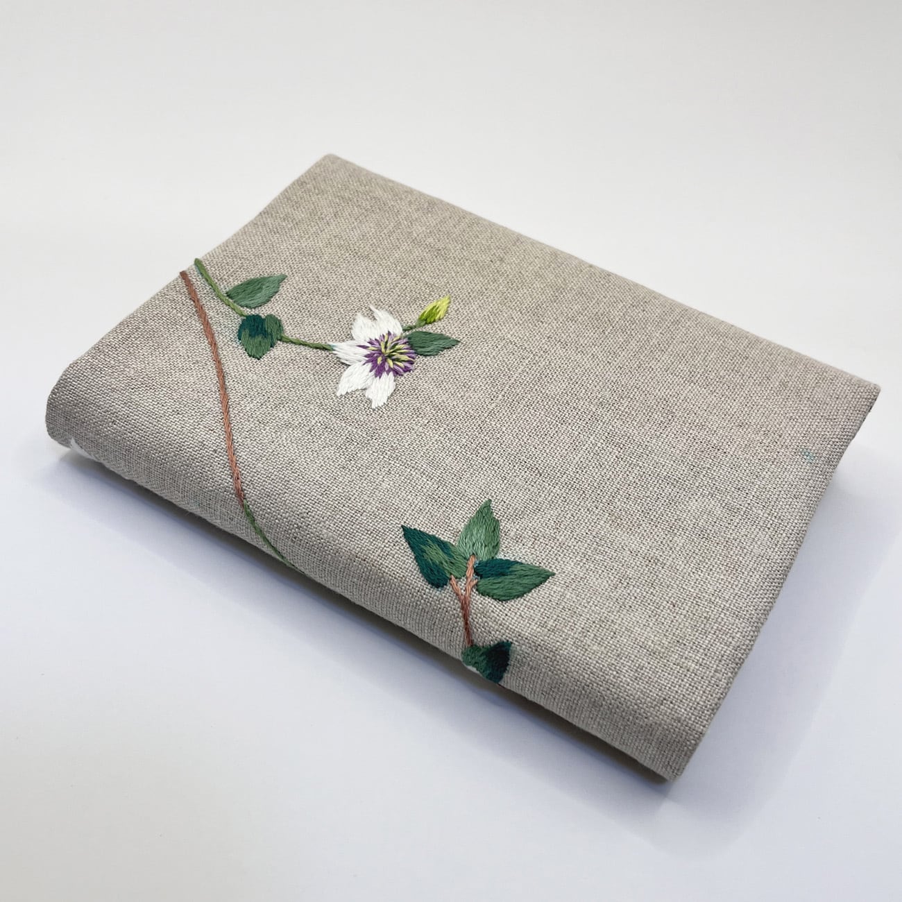 クレマチスの刺繍をした文庫本カバーです。