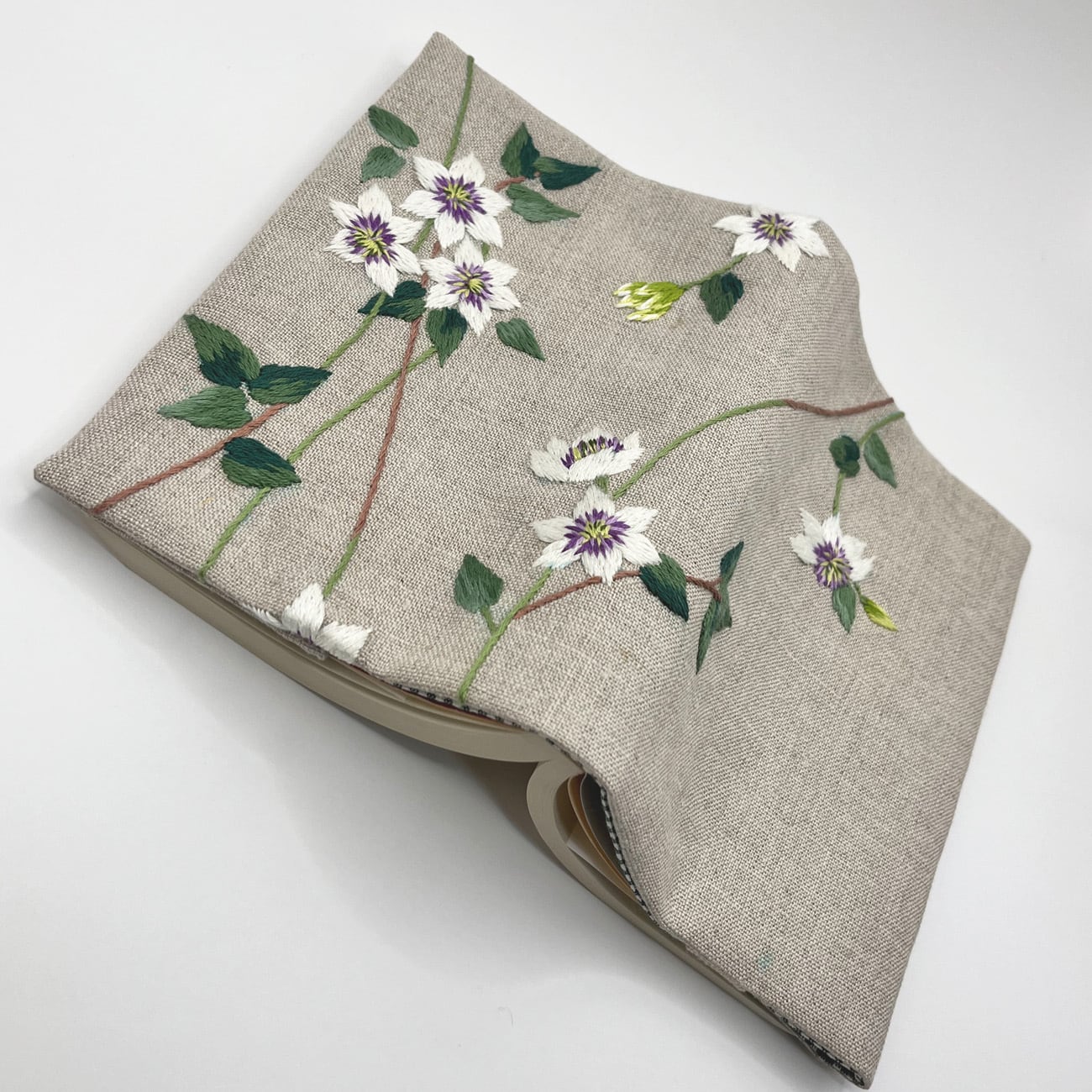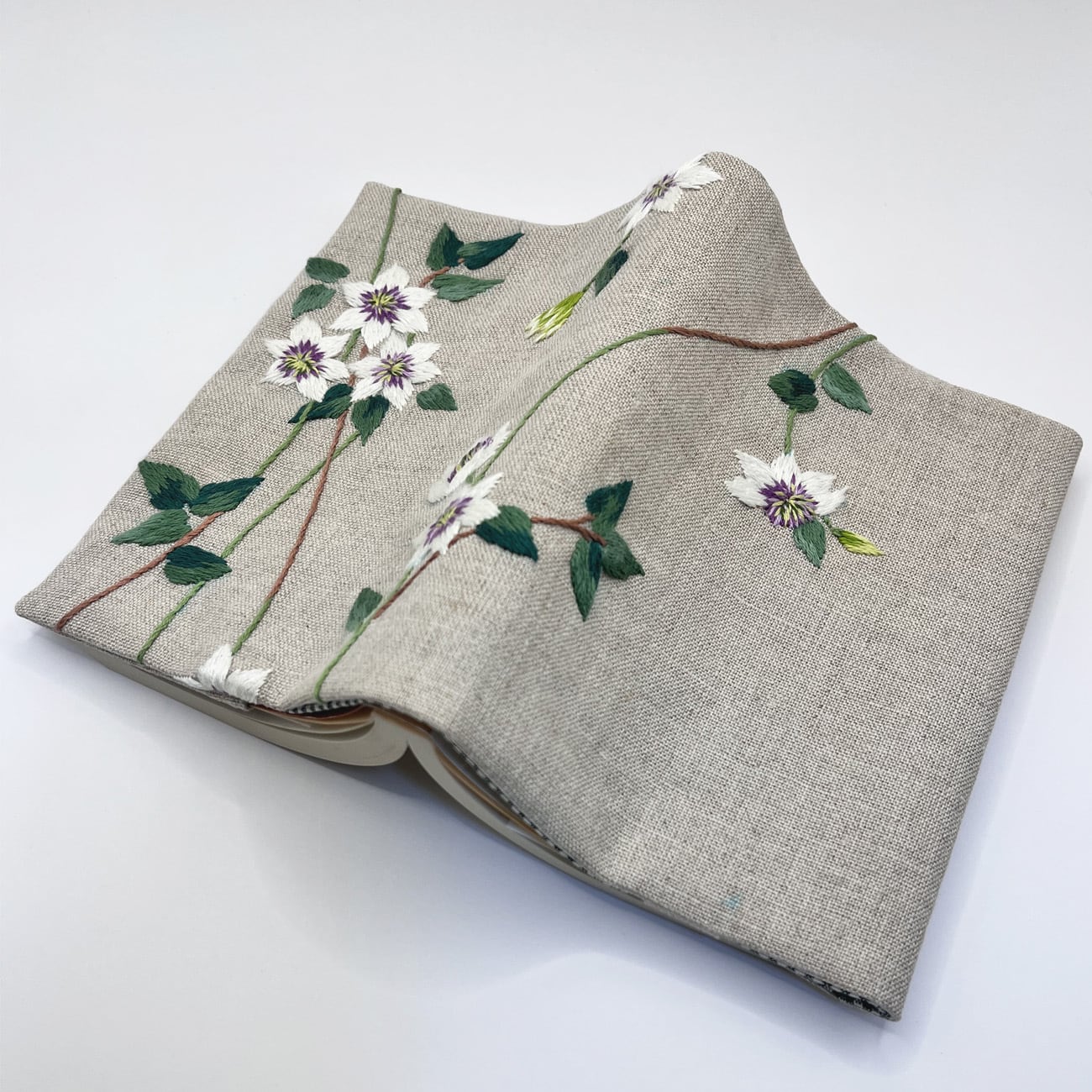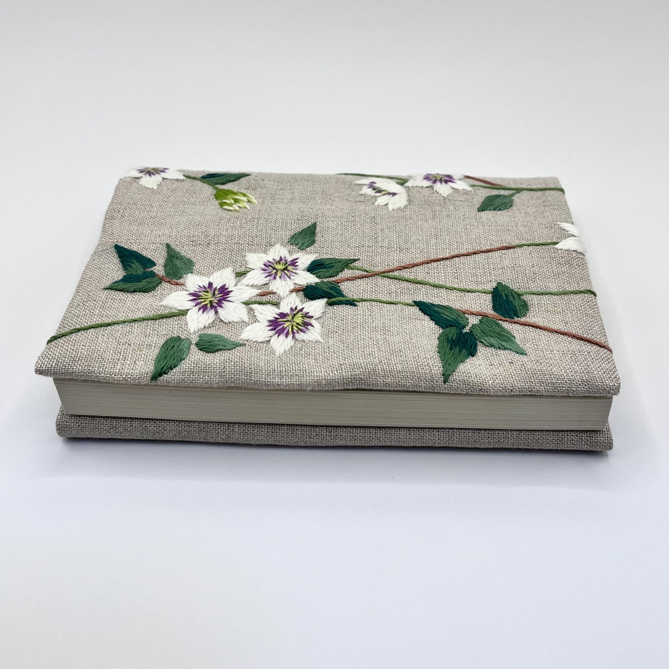 クレマチスの刺繍をした文庫本カバーです。